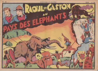 remarques: | dans la collection Aventures et Mystères numéro 34 de 3-1947, 12 pages au prix de 15.- fr grand format à l'italienne 21x30 cm les aventures des scouts Raoul et Gaston avec Fang, leur panthère noire adaptation française de l'oeuvre de Lyman Young titre: au pays des éléphants n.b. ces aventures ont aussi paru dans Heroïc (en meilleure qualité) dans ce genre, la Sage a publié de nombreux titres tel que - Mandrake le magicien (par Phil Davis et Lee Falk) - le Fantôme (par Ray Moore et Lee Falk) - Jim la Jungle (par Briggs et Raymond) - le roi de la prairie (par Kressy et Flanders) - Amok (par Tony Chan) - Bronc Peeler (by Fred Harman) - Raoul et Gaston (par Lymand Young) - agent secret X-9 (par Alex Raymond) sans atteindre à la réputation de sa grande soeur d'avant-guerre, cette publication publia les meilleures bandes dans Paris-Jeunes aventures et connut une popularité assez considérable |
