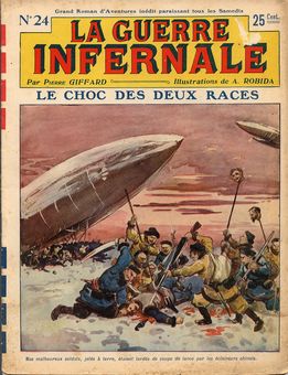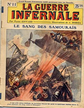 remarques: | parmi la collection "la guerre infernale" dessin A. Robida, scénario P. Giffard grand roman d'aventures inédit paraissant tous les samedis série de 30 fascicules, éditions "Méricant", roman avec quelques illustrations mais surtout intéressant de par les couvertures en couleur de Robida premier numéro le 18 janvier 1908, dernière livraison le 16 Août 1908, totalisant 951 pages avec 30 couvertures couleurs numéro 24, juillet 1908, 36 pages, au prix de 25 centimes Information 1/ guerre raciste entre blancs et jaunes une extraordinaire épopée que cette "Guerre infernale" suivant le reportage d'un journaliste de "l'an 2000" nous livrant les tenants et les aboutissants d'un terrible conflit mondial qui opposa toutes les nations du globe, si au départ nous retrouvons les deux ennemis naturels Européens, Français et Allemands, d'autres nations vont former des alliances et tenter de tirer avantage de ce formidable chaos, le moyen pour les auteurs de nous révéler un arsenal militaire innovant et des plus destructeur: vaisseaux aériens à l'image de forteresse volantes, aérocars, explosifs surpuissants, hommes-crabes, boules de feu, machine capable de geler des fleuves, fusils électriques silencieux,, faisceaux d'ondes faisant exploser à distance la poudre, armes chimiques bactériologiques et foudroyantes, obus au chloroforme..... tout un arsenal de destruction massive qui ne pouvait que mener à l'apocalypse final 2/ Albert Robida, né à Compiègne le 14 mai 1848 et mort à Neuilly-sur-Seine le 11 octobre 1926, est un illustrateur, caricaturiste, graveur, journaliste et romancier français fils d'un menuisier, il étudie pour devenir notaire, mais dans l'ennui de telles études, il s'adonne à la caricature, en 1866, il dessine au journal Amusant puis dans diverses revues, en 1879 il imagine un personnage élevé par des singes, Saturnin Farandoul, en 1880, avec l'éditeur George Decaux, il fonde sa propre revue, La Caricature, qu'il dirige pendant douze ans et dans laquelle Caran d'Ache, Louis Morin, Ferdinand Bac, Job, Maurice Radiguet font leurs débuts, il illustre des guides touristiques, des ouvrages de vulgarisation historique, des classiques littéraires: Villon, Rabelais, Cervantès, Swift, Shakespeare, les Cent Contes drolatiques d'Honoré de Balzac, les Mille et une nuits il œuvre aussi dans un registre plus léger avec une histoire des maisons closes, sa renommée s'éclipse quelque temps après la Première Guerre mondiale, Albert Robida a été redécouvert grâce à sa trilogie d'anticipation: - le Vingtième Siècle (1883) - la Guerre au vingtième siècle (1887) - le Vingtième Siècle, la vie électrique (1890) - la Guerre Infernale (1908) >> voir à ce sujet l'excellent site "sur l'autre façe du monde" ces ouvrages font de lui un autre Jules Verne, souvent plus audacieux, contrairement à Jules Verne, qui n'illustre pas par ailleurs lui-même ses récits, il propose des inventions intégrées à la vie courante et non des créations de savants fous, et chaque fois, il imagine les développements sociaux qui découlent de ses inventions, souvent avec justesse: promotion sociale des femmes (qu'il voit électrices/éligibles, portant le pantalon, fumant, médecins, notaires ou avocates), tourisme de masse, pollution, etc en 1869, déjà, Robida fait une œuvre d'anticipation avec sa bande dessinée la Guerre au vingtième siècle, campagne de Jujubie, qui décrit la guerre moderne, à base de missiles robotisés et de gaz asphyxiants il imagine ainsi le téléphonoscope, un écran plat mural qui diffuse les dernières informations à toute heure du jour et de la nuit, les dernières pièces de théâtre, des cours et des téléconférences. outre ses qualités de visionnaire, son œuvre l'Horloge des siècles (1902), avec les changements de paradigmes qu'elle présente, annonçait déjà, selon certains de ses critiques, le Philip Kindred Dick du roman à rebrousse-temps |