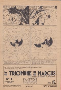 remarques: | numéro 1, 1er trim. 1948, N&B, 16 pages, au prix de 15.- fr demain, la terre sautera par G. Scolari l'invasion de la terre par des Saturniens dirigés par Mirzar leur chef et le savant fou Netrum, une sphère indestructible est lancée sur la terre, le prof. Marcus devient le défenseur de l'humanité mais ne peut empêcher que la terre soit désintégrée et scindée en deux! >> un superbe graphisme et une imagination grandiose Information 10 numéros de 1948 à 1949, intitulé Nouvelle Série une nouvelle série reprend en février 1948 pour se terminer en 1949, suite des Cahiers d'Ulysse, les Sélections Prouesses vont en rééditer les meilleures bande ou leur donner suite, notamment les italiennes jusqu'en mai 1944 la Libération venue, ils mettent à l'honneur les dessinateurs français: Bastard, Melliès, Souriau, Bourlès et Brantonne lesquels terminent honorablement la série en valeur bandes principales: les naufragés de l'air (Away), Aéroport Z (Van Straelen) et demain la terre sautera (Scolari) |