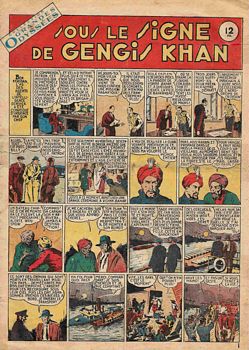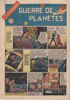 remarques: | éditeur A.B.C. puis S.A.G.E.D.I. 29 numéros de 1943 à 1946, bimensuel puis mensuel c'est avec sa suite les Grandes Odyssées, la troisième collection importante de récits complets durant l'Occupation qui se continua après-guerre avec une interruption de 6 mois entre les nos 15 et 16 pour cause de Libération principales bandes: la guerre des planètes (Scolari), Saturne contre la Terre (Scolari), Will Sparrow (C. Away) pour les Grandes Odyssées (6 nos de 1-1947 à 8-1947): le démon de l'espace et bataille de Titans (Scolari), le fantôme rouge (De Vita), sous le signe de Gengis Khan, le jaguar de Shamatel et le rescapé de l'île des lépreux (Kouznietzoff) numéro 1, 2ème trim. 1944, 16 pages au prix de 6,50 fr 50% couleur, 50% N&B guerre de planètes par Scolari un vaisseau saturnien commandé par le dictateur Mirzar et son acolyte Nutor atterrisse sur le continent arctique pour conquérir la Terre, un nuage noir meurtrier s'abat sur certaines parties de la terre et anéantissent toute vie >> p. 10 la cité fantastique créée par les plutoniens (de Pluton), alliés des terriens >> p. 14 les Saturniens qui transforment les animaux en animaux géants >> super de par le graphisme, surtout en couleur, avec un scénario débordant d'imagination par Scolari annexes - couverture no 12 guerre de planètes, collection Odyssées - couverture no 1 par Kouznietzoff, Gengis Khan, Grandes Odyssées Information Constantin Kouznietzoff (inconnu à la bedetheque) il travailla en France dans les années 40, notamment pour "la princesse Margot" dans le périodique Gavroche et "Orient Express" dans Grandes Aventures ainsi que dans la collection "Odyssées" (voir plus haut) |