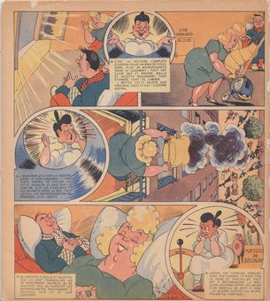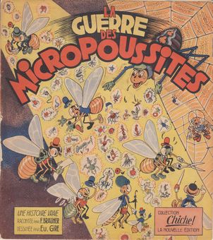remarques: | petit cahier de 12 pages sans mention de prix, une histoire vraie racontée par F. Brauner et dessiné par Eugène Gire, l'auteur de Jim Ouragan chez Artima >> de l'humour animalier genre Calvo, bien dessiné et très amusant, un exemplaire très rare Information Eugène Giroud, plus connu sous les pseudonymes d'Eugène Gire et de Eu. Gire, est un dessinateur et scénariste français de bandes dessinées, né le 16 janvier 1906 et mort le 23 novembre 1979. Eu.Gire commence sa carrière de dessinateur et illustrateur humoristique en 1937 à la Société parisienne d'édition, dans L'Épatant (1937-1939) et L'Almanach Vermot (1940), il travaille aussi pour diverses revues avant guerre et au Téméraire sous l'Occupation mais c'est à la libération que sa carrière décolle, en 1941, il se lance dans la bande dessinée avec Toto Tourbillon, puis en 1943, il figure au sommaire d'Hardi Les Gars, il entre chez Vaillant dès 1945, pour qui il réalise entre autres les aventures de R. Hudi Junior puis la Pension Radicelle très inspirée par Pim Pam Poum, Kam et Rah, A. Bâbord et Père O.K. en 1946, il participe à Vaillante le Journal des Fillettes, où il adapte Alice au Pays des Merveilles, mais il entreprend aussi diverses histoires pour la S.A.E.T.L. (Société anonyme d'éditions techniques et littéraires), en 1947, il dessine le Corsaire volant et Poste 304 dans Bob et Bobette, de 1948 à 1951, il travaille avec la "collection Hurrah!" (des aventures de Zorro et de western), puis en 1952, il reprend le Maître des corsaires et anime le premier exploit du jeune Tourville dans le Corsaire, en 1954, il réalise Jim Ouragan, publié dans Red Canyon et Ouragan (Artima) il travaille aussi dans les petits formats de Mon journal avec Capt'ain Vir de Bor qu'il transmet à son fils Michel-Paul Giroud, Jean Tambour ou le messager du Roy Henri, il dessine aussi pour la presse et imagine Jim Ouragan pour Artima. il prend sa retraite en 1967 pour cause de maladie et décède en 1979 |