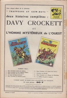 remarques: | série de 16 numéros (1956-1957) classés dans la section album du BDM, bandes non signées d'origine française et espagnole, la série Davy Crockett pourrait être dessinée par Kline, les couvertures sont de Pascal, collection "trappeurs et cow-boys" >> seul le numéro 9 est collectionné ici une bande dessinée de Davy Crockett tout à fait intéressante avec quelques illustrations pleine page + l'homme mystérieux de l'Ouest (le cavalier noir) à titre d'exemplaire représentatif de la série |
