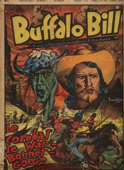 remarques: | Buffalo Bill dans la collection Hurrah des éditions Mondiales, bimensuel, 16 pages, format album, au prix de 20.- fr série de 58 numéros de 9-1948 à 2-1951 principales bandes: - Tom Mix (Liquois), Buffalo Bill (Brantonne), Zorro (Gire), mousquetaires du Far West (Brantonne), Monte-Cristo (Cazanave) numéro 6 Buffalo Bill du 25.11.1948 le combat de War-Bonnet-Gorge par Brantonne d'après le film de la 20th Century Fox >> principalement des adaptations de films cinématographiques, sans grand intérêt et le numéro collectionné ici à titre d'exemplaire représentatif de la série ne vaut pas bien sûr le Buffalo Bill bien connu de René Giffey publié dans les périodiques Tarzan et Intrépide |