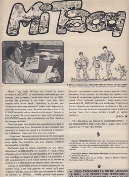 remarques: | dans la collection "les Classiques Dupuis" feuilleton en 8 épisodes sur le secret de Templiers, une aventure de Jacques Le Gall publiées dans les suppléments au journal de Spirou nos 2063 à 2071 avec dans l'épisode 8 (no 2071) >> une aventure assez bien dessinée mais parfaitement rédigée par le maître J.-M. Charlier une B.D.Scopie-Spirou sur Michel Tacq alias Mitacq n.b. cet épisode a été repris dans l'album Jacques Le Gall "premières aventures" par Mitacq et Charlier (interview avec biographie) >> voir album Jacques Le Gall |