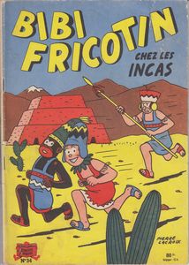 remarques: | cahier broché, 1ère édition AG, 50% couleur 50% noir&blanc, 48 pages, au prix de fr 80.-, 4ème plat PUB Pschitt, dernier titre: no 34 Bibi Fricotin chez les Incas, illustrations Lacroix, texte Lortac Bibi et Razibus avec le prof Radar entreprennent une expédition au Pérou à la recherche d'un temple inca plein de richesse mais ils sont déjà poursuivis par la bande d'Arsène le bagnard ainsi que par l'inspecteur Martin mandaté par le gouvernement pour protéger l'équipe scientifique >> p. 14 arrivée à Cuzco puis dans le pays de la mort accompagnés par l'inspecteur Martin qui deviendra à présent un personnage imbécile omni-présent dans les aventures de Bibi Fricotin >> p. 30 l'inspecteur Martin sauvé par sa chevelure rouge vif >> p. 46 Radio Luxembourg chez les Incas et après s'être débarrassés des bandits et avoir sympathisé avec les Incas, Bibi et ses amis se retrouvent à Paris avec le cadeau du dernier Inca, fils du soleil: une peinture de Bicazo >> un texte qui devient franchement un peu stupide et un graphisme de Lacroix de moindre qualité |