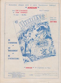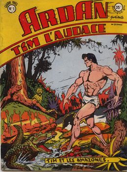 remarques: | fascicule no 1 de février 1952, une des premières publications d'Artima (n.b. Artima = abbréviation pour artisan de l'image) avec Tim l'Audace, d'abord un Tarzan brésilien qui reprendra un peu plus tard son métier de reporter, graphisme beaucoup inspiré de Hogarth série de 114 numéros de 2-1952 à 8-1961 mensuel, N&B, format Artima 22,5x17 cm, 36 pages au prix de 35,0 fr cette collection contient aussi les aventures de Tarou, l'un des meilleurs sous-tarzan français, dues au talent de Dansler (Bob Dan) et le seigneur d'Ahaggar par Le Rallic ainsi que Clark, pilote d'essai par Jacques Martin principales bandes: - Tim l'Audace (d'abord Giordan puis Bob Leguay) - Tom Tempest (Giordan) - Tarou (Bob Dan) autres bandes complémentaires: - Kromagoul, le singe qui parle (nos 27 à 75) - Rial le loup (nos 55 à 95) - Rank le valeureux (nos 64 à 92) les 5 premiers numéros sont plutôt rares d'où leurs côtes élevés à noter: les couvertures des fascicules en général bien exécutées par Bob Leguay seuls les 105 premiers numéros sont collectionnés ici numéro 1 février 1952 Tim l'Audace et les amazones, premier et dernier dessin de Tim réalisé par R. Giordan pour Ardan, Giordan illustrira toutefois les aventures de Tom Tempest en deuxième partie du cahier titre: Tim et les amazones, des combats dans la jungle contre les fauves et les indigènes, à noter en p. 25 le père de Linda en complet veston et cravatte, prisonnier des amazones 2ème partie: Tom Tempest à l'époque où les Etats-Unis connurent la ruée vers l'or et les parents de Tom firent les frais de cette période sauvage, Tom fut alors élevé par le vieux Pamperos qui voulait que Tom devienne un gentleman mais bien éduqué physiquement et psychiquement, Tom Tempest devint un justicier et défenseur des faibles |
