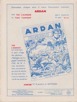 remarques: | numéro 7 d'août 1952 1/ Tim l'audace, chasse sous-marine après le départ de ses amis cinéastes, Tim est resté seul au coeur de la forêt vierge, il vit près de la nature une vie intense et riche en aventures >> p. 4 tel Tarzan, Tim est devenu le maître d'un éléphant appelé mammouth et avec des pêcheurs d'éponge, il partira à la recherche d'un trésor sous-marin 2/ Tom Tempest, l'héritage de l'oncle Stones |