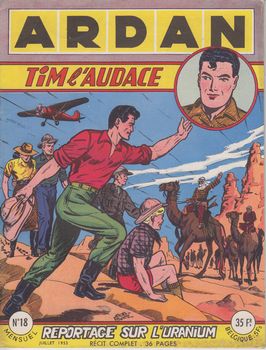 remarques: | numéro 18 de juillet 1953 1/ Tim l'audace, reportage sur l'uranium, en fait sur l'extraction de l'uranium au Congo, tiré du péchurane = minerai d'uranium n.b. 1 tonne d'uranium produit 1 g de radium et il faut plusieurs centaines de tonnes de minerai pour produire 1 tonne d'uranium 2/ Tarou, chasse à l'uranium (suite et fin) décidément on reste dans l'uranium dans ce numéro où Tarou et Denise découvrent un repaire de nazis qui ont fabriqué une soucoupe volante, ceux-ci seront anéantis et Karl+Frantz prendront la fuite, mais on les retrouvera plus tard dans les aventures de Tarou qui aura son propre titre au numéro 23 d'Ardan |