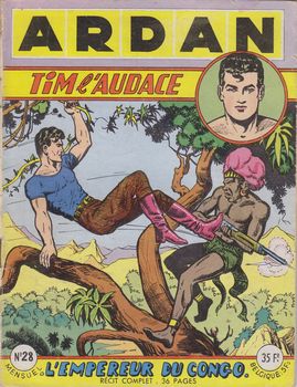 remarques: | numéro 28 de juin 1954 1/ Tim l'audace, l'empereur du Congo à noter: l'habitation sur pilotis de Tim l'audace au coeur de la jungle l'empereur du Congo = un bandit qui ranconne les voyageurs sur le fleuve Congo 2/ Kromagoul, hors des griffes des féticheurs Kromagoul n'est pas seulement un singe qui parle mais c'est aussi un singe très intelligent |