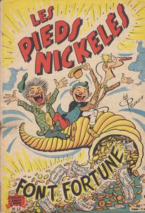 remarques: | cahier no 12 2ème édition APG 1952, 50% couleur, 50% N&B, 48 pages au prix de fr 80.-, 4ème plat Perrier, dernier titre au générique: no 26 les pieds nickelés s'évadent, texte sous images, illustrations Pellos, texte Corrald fabuleuse épopée que celle des pieds-nickelés = pieds blancs argentés, qui ne sont pas portés sur le travail avec leurs trois personnages: - Croquignol = bizarre, surprenant, drôle - Filochard = débrouillard - Ribouldingue = fêtard (faire la ribouldingue) de la quinzaine de dessinateurs qui croquèrent les aventures des trois loustics, trois se détachent particulièrement: Louis Forton, René Pellos et Pierre Lacroix (pour trois numéros) - la série est crée en 1908 par Forton dans l'Epatant, la série sera reprise par Pellos en 1948 - série AVG dans l'Epatant des éditions Offenstadt, seront publiés 5 albums de 1915 à 1917 puis 19 cahiers de 1929 à 1940 qui côtent plus de Euros 100.- selon le BDM - série APG, reprend d'abord les séries AVG en ramenant les récits de 64 pages à 48 pages, 126 cahiers de 1946 à 1988 dessinés par Forton, Lacroix mais principalement par Pellos puis encore 9 cahiers de 1994 à 2006 édités par le club des pieds-nickelés - les pieds-nickelés seront aussi publiés en albums par les éditions Azur, Veyrier, Bedesup, Vent d'Ouest, Regards = les amis de Pellos et par Rombaldi n.b. seuls quelques numéros éparses sont collectionnés ici à titre d'exemplaires représentatifs de la série no 12 les Pieds-Nickelés font fortune les trois clochards Ribouldingue, Filochard et Croquignol, surnommés les DURS ont l'espoir de faire fortune, l'un ayant hérité de son oncle Babylas, l'autre avec un tableau de grande valeur de Pikato découvert par hasard et le dernier avec un billet de loterie et effectivement ce sera l'héritage de Babylas dont Ribouldingue reçoit une avance, le tableau vendu pour 5 millions et le billet de loterie 7.777.777 qui gagne 3 millions et notre trio va utiliser à fond leur nouvelle fortune >> p. 6 Filochard qui s'emporte comme une soupe-au-lait présente une étrange particularité: plutôt chétif à l'état normal, il devient subitement d'une force herculéenne dès qu'il est sous l'empire de la colère >> p. 10/11 le trio fait de la philanthropie en invitant les clochards de la Seine à un grand festin >> p. 11 le duel à la tomate avec le duc d'Auteuil puis c'est l'ouverture du bal des clochards où la haute société des snobs passe à la caisse, mais le trio se fait es-cro-quignoler et doit faire façe au syndicat des affameurs et à Fantomard publicité pour la viande de boeuf avec les oeils-de-boeuf et les yeux de vache, enfin ce sera la construction d'une voiture populaire qui sera appelée "l'oeuf à roulette" >> la nouvelle fortune des pieds-nickelés sera surtout utilisée pour combattre le marché noir (on est en 1946-48) et les pieds-nickelés redresseurs de tort dans ce cahier prendront la défense des consommateurs le texte est plutôt cocasse et peu recherché, genre Bibi Fricotin et Charlot mais le graphisme de Pellos est de bonne qualité |