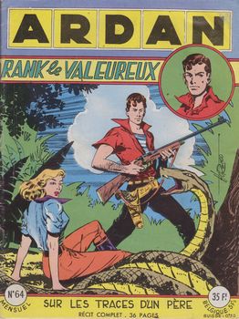 remarques: | numéro 64 de juin 1957 1/ début de Rank le valeureux par Geo Mattei, sur les traces d'un père (Rank le valeureux est un substitut de Tim l'audace, dont l'auteur Mattei est inconnu au BDM et dont les bandes, surtout pour le graphisme, sont bien moins bonnes que celles du Tim l'audace de Leguay, idem pour les couvertures) 2/ Rial le chien-loup, Jack le métis |