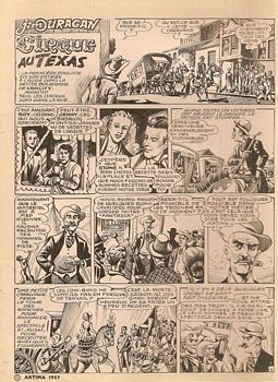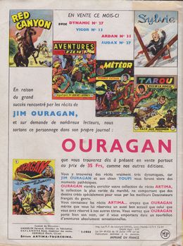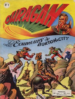 remarques: | série de 43 numéros de janvier 1955 à août 1958, pas de numéros spéciaux, bande principale avec Jim Ouragan, accompagné de son fidèle chien Youpi et avec quelques récits en 2ème partie avec Tex Bill, une excellente série western tant pour le graphisme que pour le scénario, dessinée par Eugène Gire (messager du roi Henri, la pension Radicelle) avec son héros Jim Ouragan dont les aventures se terminent au no 34, remplacé par Jim Star (auteur inconnu), cette série comporte également des couvertures de bonne qualité (du moins par Eugène Gire) >> seuls 39 numéros (de 43) sont collectionnés ici, la série devenant bien moins intéressante à partir du dernier numéro 34 de Jim Ouragan par Gire n.b. il existe encore 2 séries Ouragan petit format 1/ 29 nos du 2-1967 au 12-1969 2/ 10 nos du 1-1984 à 9-1985 mais sans grand intérêt numéro 1 de janvier 1955 les écumeurs de Burton City, part 1 >> un bon graphisme et un scénario honorable + révolte chez les cow-boys avec Tex Bill par Melliès aventures reprises des cahiers "une aventure de " (Artima 1ère série) qui avaient comme titre - Aventure de (1949-1950) avec Jack Sport, Luc Hardy, Bill Tornade, Tex Bill, Tarou, Wonderman, Tony Cyclone - Audax (1950-1953) avec principalement Bill Tornade - Dynamic (1950-1954) avec principalement Tex Bill, Tarou, Wonderman, Tony Cyclone et Vigor annexes - no 1 1er et 4ème plat - une planche de Jim Ouragan |
