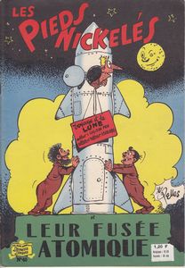 remarques: | cahier no 40, 2ème édition APG 1960, 4ème plat bonbons Pschitt, 50% couleur, 50% N&B, 48 pages, prix Fr 1,20, dernier titre: no 51 les pieds nickelés sur Bêta 2, illustrations Pellos, texte Montaubert les pieds nickelés s'intéressent maintenant à la lune pour réaliser des affaires fructueuses, ils engagent un vieux clochard comme professeur spécialiste de l'astronomie et déjà les premiers constructeurs de fusée se laissent rouler le départ pour la lune est prévu avec 50 volontaires qui payent cher leur ticket de transport mais le voyage ne va pas plus loin qu'un terrain vague amménagé en paysage lunaire >> p. 19 l'arrivée sur la lune après ce coup, le professeur disparaît avec la caisse, les pieds nickelés sont ruinés mais le monde entier avait pris la chose au sérieux et les pieds nickelés sont sollicités par un riche pays (le Haut-Duras) pour construire une autre fusée et les pieds nickelés renouvellent leur coup avec de nouveaux pigeons mais cette fois font fabriquer des scaphandres à gaz pour simuler la pesanteur lunaire lors de l'allunissage >> p. 32 le bar sur la lune aux prix astronomiques leur coup effectué, ils doivent s'enfuir sur un bateau, mais celui-ci se révèle être un navire d'exploration polaire et il leur faudra encore participer à des mésaventures frigorifiantes avant de finalement se retrouver à Paris pas plus riches qu'avant >> pas très convaincante cette histoire déjà bien exploitée mais amusante et surtout bien dessinée par Pellos |