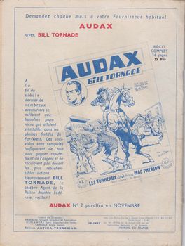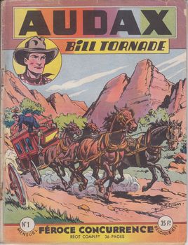 remarques: | série de 104 numéros de 10-1952 à 7-1961, il existe 4 numéros spéciaux, une des meilleurs séries Artima avec Tarou, Météor, Ouragan, Panda et Vigor, Audax avec Ardan et Aventures Film sont les premières séries (2ème série dès 1952) à paraître aux éditions Artima (n.b. Artima = abbréviation pour artisan de l'image) bandes principales: - Bill Tornade de Bob Dan avec aussi au début Tex Bill de Melliès et Tom Tempest de R. Giordan, contient aussi des bandes d'origine espagnole de moindre qualité, notamment la série de Chico Suarez qui débute au no 54 et qui me peut égaler celle de Bill Tornade >> seuls les 52 premiers numéros avec Bill Tornade y compris les 4 numéros spéciaux sont collectionnés ici n.b. il existe deux autres séries de Bill Tornade en petit format: a) 83 numéros de 4-1960 à 6-1969 b) 32 numéros de 9-1975 à 3-1982 numéro 1 d'octobre 1952 une aventure de Bill Tornade, féroce concurrence entre la K-D line (Kansas-Denver) et la Thompson Line ou Sioux Speed Line avec une diligence blindée n.b. Bill Tornade est un agent fédéral, il est dès le no 2 toujours accompagné du jeune David Stone comme adjoint et a comme ami le chef sioux Soleil Rouge >> des aventures bien dessinées et au scénario intéressant par Robert Dansler alias Bob Dan biographie >> voir Tarou no 1 Information Bill Tornade a reçu pour mission officielle du Gouvernement des Etats-Unis, en tant qu'agent fédéral, à faire la chasse aux hors la loi de toutes sortes et à accomplir un travail de pacification auprès des populations indiennes apparu dès la fin des années 40 aux éditions Artima dans la revue Audax, ce personnage a connu de nombreuses histoires plus palpitantes les unes que les autres, certaines d'entre elles n'étant pas d'ailleurs dénuées de toute connotation policière |