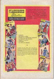 remarques: | d'après l'oeuvre d'Erckmann-Chatrian, cahier broché, relatant les plus célèbres aventures de la littérature classique, 100% couleur, 48 pages, l'épopée d'un jeune homme rescapé des armées napoléoniennes durant les batailles de Ligny et de Waterloo >> un texte assez bon mais un graphisme peu recherché comme d'ailleurs dans presque tous les autres cahiers N.B. dessin collectif, éditions Williams, adaptation en bandes dessinées de grands classiques de la littérature par des dessinateurs essentiellement anglo-saxons, il y eu une édition anglaise, américaine et française, celle-ci comportait deux séries première série no 1 1957 kidnappé d’après R.L. Stevenson, dernier numéro no 68 Tim Brown au collège (1961) deuxième série no 1 1973 les trois mousquetaires (principalement des rééditions de la première série), dernier numéro no 15 la conquête du Mexique (1974) dessin: collectif (Peter Costanza, Stan Campbell, R. Evans, N.Nodel, Anna Swell, etc), il y eut aussi une édition anglaise et américaine son principal concurrent fut Mondial Aventures de la SPE qui ne produisit que 31 numéros (le premier en 1953) mais de qualité supérieure tant pour le graphisme que pour le texte, la côte est en conséquence bien supérieure aux Classiques Illustrés |