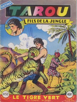 remarques: | numéro 52 d'avril 1958 1/ Tarou, le tigre vert où Salvator , le lion trouve temporairement une compagne en la lionne Bella 2/ le roi Hanbélik, l'exode les conseillers d'Hanbélik: Oronjai et Onburu, guerre psychologique contre le roi Hanbélik |