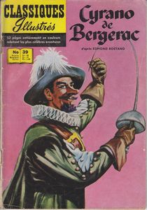 remarques: | récit adapté du roman d'Edmond Rostand 1640 Cyrano de Bergerac et son nez, poète (avec ses jeux de mots impressionnants) et bretteur de première qualité qui aime sa cousine Roxane mais qui n'ose pas lui avouer son amour à cause de son nez (un roc, un pic que dis-je une péninsule!), la plus grande lame du royaume périra victime d'un attentat abject >> texte peu convaincant et graphisme très moyen |