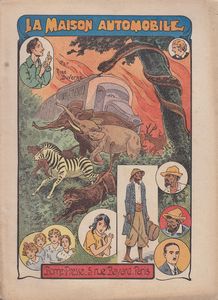 remarques: | les romans cinématiques sont le nom d'une collection de livres à destination des jeunes lancée par la Maison de la Bonne Presse en 1920, les illustrations y occupent la moitié des pages, le premier volume est le roi de l'or par Alice Pujo, une cinquantaine de récits seront publiés jusqu'en 1956, les auteurs les plus fréquents, outre ce dernier, sont René Duverne, Max Colomban, Henriette Robitaillie et auatres, les illustrateurs comprennent notamment Eugène Damblans, Grand'Aigle, Gaston Jacquement, Pierredec et autres édition 1933, genre hybride entre le roman illustré et l'histoire en images, prépublié dans "l'écho du Noël", l'étoile Noëliste et Bernadette", de la Maison de la Bonne Presse à Bayard Presse, de L’Echo du Noël (1906) à j’aime la B.D. (2004), un siècle de presse juvénile catholique >>> article détaillé sur les éditions Bonne Presse, romans cinématiques >> voir cahier no 1 n.b. les éditions cartonnées côtent 50% plus cher que les brochées tout comme les 10 premiers numéros René Duverne, né en 1893 à Lure et mort en 1974, est un écrivain français de romans pour la jeunesse, il a également publié sous le pseudonyme Pierre Régis, il a été fonctionnaire au ministère des finances cahier no 27, 1933, 52 pages doubles la famille Crozières gagne à la tombola une roulotte automobile avec chauffeur, les Crozières décident de se rendre en Afrique avec la maison automobile pour secourir la petite Lili, fille du frère de Crozières, victime d'un mauvais individu en Rhodésie anglaise >> p. 3/4 la maison automobile et sa description >> p. 5 il faudra bien prier le bon dieu pour qu'il nous protège et le curé de la paroisse voulut bénir la maison automobile pour appeler aussi sur elle la bienveillance divine voyage vers l'Egypte en bateau, rencontre à Alexandrie des deux soeurs religieuses Marie-Angèle et Marie-Paule qui se rendent aussi dans le sud de l'Afrique, rencontre aussi avec un curieux individu, le noir Ben Soussan Gustave qui s'offre comme guide et homme à tout faire première partie du voyage africain: Alexandrie-Khartoum par la vallée du Nil puis on fait voyage ensemble avec l'ingénieur Chorey qui se rend en Ouganda avec son auto-chenille mais le trajet via le Nil Blanc vers l'Ouganda n'est plus aussi facile d'accès que jusqu'alors, les difficultées commençaient >> p. 15 un fusil à balles explosives le lac Victoria est atteint le 19 juillet après déjà un mois de voyage depuis Marseille prochain objectif: le lac Tanganyka, premier obstacle: la traversée d'une rivière importante et il n'y a pas de pont, durant la traversée à gué, la maison automobile tombe en panne >> p. 18 par bonheur, dans cette ex-colonie allemande de l'est africain, la domination européenne a inspiré aux indigènes la crainte et le respect du blanc... dépanné par des cafres grâce à l'aide de Gustave, Crozières père offre aux indigènes des "havanes" comme récompense!! à un certain moment, les membres de la maison automobile se retrouvent séparés, les 4 enfants et Mlle Farel, leur bonne, restent seuls dans la roulotte >> p. 21 la prière au pied du crucifix accroché au panneau de fond de la roulotte la petite équipe tombe sur un aviateur échoué dans la jungle et sous ses instructions, Mlle Farel se met au volant et la maison-automobile continue sa route >> p. 25 la jungle est en feu ensuite il faut encore se débarrasser des marchands d'esclaves, heureusement Gustave est de retour et fait fuir les esclavagistes, par la même occasion on retrouve papa et maman Crozières et le chauffeur Jeudy qui étaient prisonniers des marchands d'esclaves, puis la roulotte-automobile peut être ravitaillée d'essence grâce à l'arrivée de l'auto-chenille d'un père blanc accompagné des deux soeurs religieuses qui fait route vers le Nyassaland prochaine étape le lac Tanganyka sur lequel le trajet se poursuit par bateau d'Ousoumboura (Burundi) à Kasanga (Tanzania) >> p. 36 tempête sur le lac mais la tempête s'éloigne après une prière adressée au Maître des Cieux arrivée au Katanga et pour rejoindre la petite Lili, on abandonne temporairement la roulotte en empruntant deux automobiles pour se rendre à l'hacienda où le méchant maltais Morini retient la petite Lili sous sa domination et ce sera à nouveau Gustave qui obtiendra la libération de la petite Lili, les méchants seront punis et tout le monde retourne en France avec la fameuse roulotte mais cette fois tout le trajet s'effectue en bateau depuis la côte ouest africaine vers Marseille >> un cahier très populaire parmi les lecteurs de Bonne Presse ce qui lui valut une réédition en 1953 (mais de pauvre qualité, voir ce titre), ce deuxième récit de Duverne est cette fois plus naïf que celui du lac mystérieux, intéressant de par quelques illustrations bien faites et de par les informations géographiques et culturelles durant l'expédition mais cette fois l'élément religieux est beaucoup plus présent que dans le cahier précédent (demande concrète de l'éditeur?) et contient à nouveau quelques éléments racistes mais on est en 1933! à noter: le langage petit-nègre de Gustave et le langage poétique du chauffeur Jeudy |