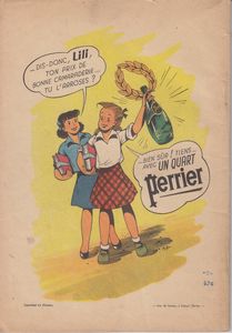 remarques: | no 7 l'espiègle Lili travaille, édition originale 1951, 48 pages, 50% couleur 50% N&B, fr 75.-, 4ème plat un quart Perrier, premier cahier sans texte sous l'image, mentionne aussi les aventures de Durga Rani, Miki no 4, Oscar no 7 et Aggie no 5, illustrations Al.G, scénario Bernadette Hiéris Lili travaille no 7 et Lili aux Indes no 8 sont les deux premiers numéros avec texte dans l'image, les 6 numéros précédents APRG ayant le texte sous les images ses parents partis à l'étranger, Lili reste seule à Paris avec sa tante Agathe et sa cousine Julia de Saint-Herbu (2 pestes), mais aussi avec son fidèle ami monsieur Minet (un genre d'escogriffe avec barbiche) et Lili doit chercher du travail, d'abord Lile travaille dans une confiserie où elle ne récolte que du succès, ne voulant toutefois pas faire des excuses à sa patronne pour une faute qu'elle n'a pas commise, Lili devient maraîchère chez la famille Rabouille, un travail pénible mais Lili est comblée >> p. 24 le mariage d'Estelle avec promenade à âne et la déconfiture de Julia par la suite, Lili adopte un chien abandonné qu'elle baptise Fidèle, puis de chien à chat, Lili ouvre un magasin d'animaux exotiques (singes, pélican, caméléon, etc) mais doit bientôt le fermer suite aux plaintes des voisins >> p. 33 le pélican qui a avalé un parapluie de travers! les Rabouille se retirent à la campagne et Lili se recycle dans la haute-couture elle sera mêlée à une affaire de vol qui la conduira au cabaret "la souris sans tête" mais s'en sortira allégrement grâce à ses bons amis >> p. 44 un horrible milieu où les gens se dégradent (Lili dixit concernant le cabaret), ouf, la morale est sauve pour les fillettes! >> Lili l'espiègle est une série principalement publiée pour les gentilles jeunes filles (qui peuvent parfois être quelque peu effrontées >> voir p. 45 le comportement de Lili) mais le graphisme est remarquable et le texte fort honorable, probablement un des meilleurs cahiers de la série, à lire avec un quart Perrier! |