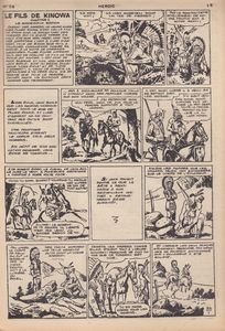 remarques: | no 26 du 20.4.1951 avec une couverture de Raphaël début de la série Kinowa: le fils de Kinowa = Kinowa I probablement la meilleure bande dessinée du fascicule Heroic, graphisme par: - Giovanni Sinchetto (1925-1991) - Dario Guzzon (1926-2000) - Pietro Sartori (1926-1989) groupés sous le pseudonyme de Esse G. Esse, auteurs également de capitaine Miki et de Blek, avec la collaboration de la dessinatrice Lina Buffolente (dessinatrice entre autre de Kid le Libérateur dans le journal l'Intrépide), le scénario est de Andrea Lavezzolo le premier épisode parait du fascicule no 26 (20.4.1951) au no 30 (20.6.1951) en 12 planches par fascicule divisé en 10 chapitres: 1/ le mystérieux espion 2/ tragique poursuite 3/ le fantôme de Kinowa 4/ la montagne perdue 5/ la prophétie indienne 6/ de mystère en mystère 7/ l'or des comanches 8/ la vallée inconnue 9/ fuite désespérée 10/ la ruse de Plume Rouge résumé des aventures précédentes: durant des années, le jeune guerrier Plume Rouge s'est cru le fils de Bison Noir, le grand chef des pawnies qui l'a élevé comme s'il avait été son vrai père, une tendre affection unit Plume Rouge à Lune d'Argent, fille adoptive (une princesse comanche) de Bison Noir, à la suite de diverses aventures, Plume Rouge apprend qu'il est en réalité le fils du scout de Sam Boyle, dit Kinowa (la terreur des indiens et qui marque les criminels qu'il vient de châtier avec le signe du serpent), Plume Rouge est donc de race blanche et son vrai nom est Jack Boyle, aidé du brave éclaireur "Long Rifle" un ami de Sam Boyle, Plume Rouge appelé maintenant Silver Gek ou l'Indien Blanc vient de donner une sépulture à ce père qu'il n'a retrouvé que pour le perdre n.b. Kinowa = un personnage mystique mais qui aurait existé = Sam Boyle, un scout du gouvernement, en son temps scalpé par les indiens, prend l'aspect du fantômatique personnage de Kinowa pour combattre les indiens, il deviendra la terreur des indiens et marque les criminels qu'il vient de châtier avec le signe du serpent, Long Rifle, de son vrai nom Featerstone Browns Willer Williamson dit Long Rifle l'action commence quand deux indiens dont un sorcier observent la tombe de Sam Boyle et s'empare de son corps entretemps, Silver Gek (maintenant habillé en scout), Long Rifle et Lune d'Argent veulent, comme Sam Boyle l'avait demandé, amener Lune d'Argent dans des régions civilisées pour parfaire son éducation mais il leur faut d'abord éclaircir le mystère du ranch d'Herman Boston, Lune d'Argent est blessée et conduite par Silver Gek chez un homme-médecin dans un sactuaire sacré des pawnies >> p. 27/6 Kinowa ressuscité >> p. 27/7 le sanctuaire sacré du grand Manitou et la guérison-miracle de Lune d'Argent puis le trio part chercher l'or de Sam Boyle à Brandy Falls >> p. 28/6 erreur: Lune d'Argent est appelé Oeil de Lune >> p. 28/7 le visage de Long Rifle l'or de Sam Boyle disparu, Lune d'Argent les conduit au lieu où est caché l'or des comanches, prisonniers dans la mine d'or des comanches, voyage au centre de la terre, arrivée dans la vallée secrète où Lune d'Argent , capturée par les comanches, est délivrée, poursuivis par les comanches, nos amis réussiront à s'échapper grâce à la ruse de Silver Gek >> fin du premier épisode (suite au no 31), ce n'est pas le meilleur épisode de la série mais texte et graphisme sont déjà bien marqués et s'amélioreront encore par la suite autres bandes: - le petit capitaine - Raoul et Gaston - roman-feuilleton: le trésor de l'abbaye - une partie d'échec (récit complet) - Nestor et Félix + une jolie couverture probablement de Raphaël |