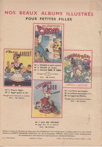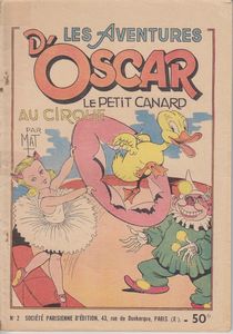 remarques: | édition novembre 1949, 9 titres au 4ème plat, 48 pages, au prix de fr 50.- Oscar continue à en faire des siennes au château de ses maîtres, ensemble avec Zouzou, le chien, Minet le chat et Coco le perroquet (Oscar a en tout cas toujours bon appétit!) mais il commence a avoir marre de cette vie et pense aller à Paris entretemps, un cirque arrive dans la région, Bibi le canard savant du cirque est l'une des attractions mais il disparait et ce sera Oscar qui prendra sa place >> p. 30 tante Zulma en cage! finalement Oscar atteindra Paris où il se rend compte que la vie n'y est guère meilleure >> c'est pas encore le prix du meilleur Oscar mais le graphisme de Mat reste respectable |