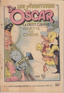 remarques: | édition novembre 1949, 48 pages, 9 titres au 4ème plat, prix fr 50.- Oscar se retrouve enfermé dans un zoo à Paris mais il réussit à s'évader et fait la connaissance des animaux du zoo, à nouveau capturé, il est finalement délivré par Josette, Oscar accompagne Josette à l'école et gagne le premier prix lors d'une exposition, il devient alors une vedette et le cinéma s'empare de lui, il devient ainsi le rival de Donald >> p. 19 tout le monde devient intoxinématoqué! avant de partir pour l'Amérique (Hollywood) avec son metteur en scène, Josette et la tante Zulma, Oscar doit prendre l'accent du canard américain >> p. 29 tante Zulma qui s'exerce à devenir Robinson en cas de naufrage réception à New York où les gangsters tentent déjà de kidnapper Oscar pour en tirer une rançon, leur tentative échoue mais la publicité suite à cette affaire rend Oscar célèbre >> p. 40 tante Zulma habillée en starlet >> Oscar n'est pas encore une star de BD mais ses aventures restent amusantes et tante Zulma commence lentement à devenir la vedette du journal |