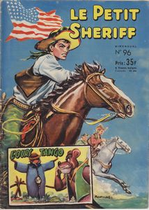 remarques: | no 96 du 25.5.1954 les aventures de Kit 1/ le vénérable l'histoire du vénérable recueilli par le père de Peggy, de par ses dons de magicien, le vénérable prend le contrôle du père de Peggy et devient le chef d'une secte, de leur côté les deux shériffs veulent arrêter Robin mais Kit découvre que le vrai meurtrier est Tom, le nègre qui a tué le vénérable en croyant faire une bonne action, Tom veut se débarrasser du petit shériff, mais sa tentative échouera et c'est lui qui perd la vie à son tour >> p. 4 le petit shériff qui enfermé dans un sac tire avec son pistolet à travers le sac pour se libérer 2/ Gueguen le peau-rouge retrouvailles avec Paul, le soldat ami de Kit promu maintenant sergent et qui ui remet à Kit une note du général Quist qui demande à Kit son appui dans une guerre contre les indiens séminoles alliés avec les sioux et les cheyenne, Kit fera fonction de guide pour la troupe du colonel van Ryn assisté du major Rhumes qui n'aime pas Kit et qui aimerait plutôt avoir Gueguen, un guide indien de la tribu des Abanaki, mais Kit soupçonne Gueguen d'être un espion des séminoles et quand Van Ryn meurt dans une embuscade, Rhumes prend le commandement, réintègre Guenguen et congédie le duo Kit/Garrett les deux amis restent toutefois dans les environs pour surveiller le déroulement de la campagne menée maintenant par le major Rhumes - film-feuilleton: la dernière flèche avec Tyrone Power - récit complet: le fils du shériff - récit comique: l'ours Tango |