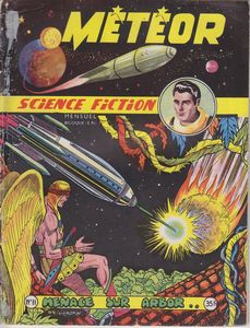 remarques: | no 11 d'avril 1954 lors de leur exploration, Spencer et Cie découvrent une planète menacée par un météorite radio-actif cette planète qui s'appelle Arbor est peuplée d'hommes oiseaux qui ont leurs "nids" au sommet des arbres et d'hommes-rampants, adversaires des hommes-oiseaux, qui eux habitent des cavernes et sont moins évolués mais plus robustes après une opération stellaire spectaculaire, le trio Spencer détruira le météorite dangereux >> p. 18 le Titanic de l'espace et réconciliera les deux peuples tout en étudiant leur régime alimentaire qui leur apporte longévité, santé et robustesse puis les terriens repartiront pour de nouvelles aventures >> p. 22 le régime alimentaire sur Arbor >> un fascicule qui nous donne des cours d'alimentation saine et qui devrait être subventionné par la SECU (assurance maladie) à noter: une jolie couverture de fascicule |