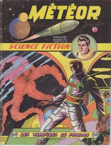 remarques: | fascicule no 37 de juin 1956 en arrivant sur la planète Pomona, la fusée des terriens est agressée par un monstre gazeux, rencontre pas très amical avec les habitants de Pomona qui vivent encore au 16ème siècle sous la dictature de lord Kenneth et qui sont également pris à partie par les monstres gazeux lumineux qui traversent les murs et sucent le sang des globules rouges des Pomoniens >> p. 6/6 l'histoire des écossais catholiques qui quittèrent leur patrie étant persécutés par les anglais protestants, réfugiés en France, Leonard de Vinci leur confectionna un ballon spatial, genre arche de Noé, pour se réfugier sur une autre planète, ils fondèrent ainsi sans esprit de retour la planète Pomona, du nom de leur île natale, une des Orcades mais parmi la population, il y a maintenant des dissidents qui veulent renverser le tyran lord Kenneth, les terriens chasseront les monstres en utilisant des ventilateurs pour les éloigner et les détruiront avec du gaz d'azote auquel ils mettent le feu et qui anéantissent les monstres gazeux en les faisant exploser puis ils aideront les deux groupes pomoniens à établir un régime démocratique sur Pomona >> p. 34 fiers de ce résultat, nos trois modernes chevaliers errants reprirent le coeur joyeux leurs hasardeuses pérégrinations à travers les mondes lointains de la galaxie!! et une couverture plutôt bin faite |
