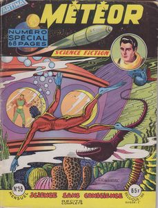 remarques: | fascicule spécial no 58, 68 pages, de février 1958 1ère partie: science sans conscience à bord de Space Girl II, Spencer et ses amis glissent dans le vide absolu, ils abordent une planète à la luminosité intense et y trouvent une race très évoluée mais avec les doigts palmés, c'est la planète Amphibia où les habitants vivent dans la mer pour se protéger des rayons solaires intensifs >> p. 6 la nourriture à base de plancton >> p. 11 l'histoire des amphibiens qui veulent transformer à leur anatomie une race subordonnée, les phyliens, grâce à une science inconsciente >> p. 27 les expériences inhumaines sur la femme Gesli après avoir fait abandonner leur entreprise aux amphibiens et avoir créé un nouveau monde avec une science plus humaine, nos amis reprirent leur vol vers de nouvelles aventures 2ème partie: un épisode de Kid Meteor en l'an 2000 sur la Terre où se déroule une lutte pour l'exploitation de Mars après des aventures sur la lune et sur la planète Mars, Kid Meteor viendra à bout de ses adversaires >> p. 26 les monstres de Mars une fois de plus, la justice sera sortie victorieuse dans sa lutte contre le crime une histoire au titre opportuniste d'origine espagnole et dessinée par l'excellent Boixcar que l'on retrouvera très souvent dans le fascicule Monde Futur >> deux récits sans grande surprise mais avec une jolie couverture |