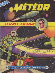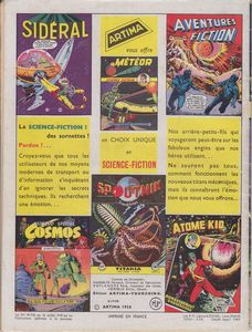 remarques: | fascicule no 60 d'avril 1958 Spencer et ses assistants doivent s'occuper du satellite V13 qui ne répond plus; après avoir rejoint celui-ci, les terriens découvrent que son équipage est atteint de folie en poursuivant leurs recherches, ils découvrent Targal, un extra-terrestre >> p. 8 l'histoire de Targal: deux peuples d'une planète, les Culoringiens, des êtres bleus dominateurs, et les Zinopantes, des dominés verts, dont Targal fait partie, ont pris contact avec le satellite Rodax, un général culoringien, chef de mission belliqueux, a plongé le satellite en léthargie à l'aide de son rayon zygolopique, l'a investi dans le but de dérober ses puissantes armes et de les ramener sur Ortis en vue de conquérir la terre >> p. 27 le pistolet désintégrateur caché dans une semelle après avoir neutralisé les envahisseurs dont Rodax, pourchassé par un robot-chercheur des terriens, nos amis repartent vers des mondes lointains pour y retrouver l'éternelle aventure >> un récit pas très exceptionnel mais dans la moyenne annexes - couverture du fascicule - 4ème plat avec les 6 séries science-fiction publiées par Artima soit Météor, Spoutnik, Cosmos, Atome Kid, Sidéral et Aventures Fiction, une prochaine série s'y ajoutera: Monde futur |