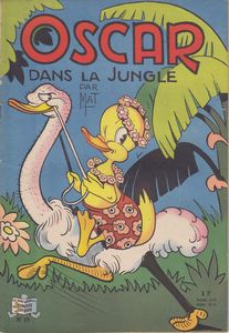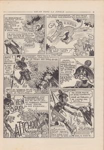 remarques: | cahier broché EO noir&blanc, 48 pages, 4ème plat PUB Pschitt nouveau graphisme, au prix de 1 F Oscar veut se changer les idées et entreprend un voyage avec la Pan Plainair's Line mais durant le vol, il est éjecté et atterrit en pleine jungle >> p. 9 où il ne peut s'alimenter qu'en gros parmi les monstres de la jungle il est toutefois sauvé par le singe Sapajou qui conduit Oscar chez une tribu de papous où il est considéré comme Urara, l'oiseau fétiche sacré, il réussit à échapper au sorcier Okéla-Freu mais se retrouve à nouveau confronté aux dangers de la jungle >> p. 16 Oscar devenu le point de mire des oiseaux de la jungle Oscar rencontre à nouveau les monstres de la jungle soit la tortue éléphantine, Goulu l'ours des ruchers, Avaltoucru l'alligator, le vampire, les piranhas, Croquedur le puma, Kranepas le mouflon et Dan Dasié le jaguar, rencontre aussi avec Tapy-Yoka le guerrier qui prend Oscar comme appât pour capturer son gibier; finalement dégoûté par la jungle, Oscar décide de rentrer chez lui et s'embarque sur un voilier, fin des aventures d'Oscar (du moins en cahiers) malgré que l'auteur nous annonce en dernière page: "dans quelles aventures, Oscar s'est-il encore embarqué?.. vous le saurez sans doute bientôt" >> mais ce sera le dernier et probablement le plus mauvais cahier d'Oscar, n.b. on n'y mentionne plus ni tante Zulma ni Josette, dont les aventures se poursuivront encore quelque temps, mais en moindre qualité dans le journal de Bibi Fricotin |