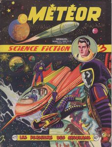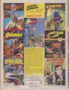 remarques: | fascicule no 71 de mars 1959 rencontre avec une fusée en perdition et après avoir abordé la fusée, nos amis terriens tireront les membres de l'équipage d'une hibernation forcée et le dr Spencer et ses assistants aideront l'équipage à remettre la fusée en fonction pour regagner la planète-patrie qui entretemps a subi des changements et où règnent à présent des sauvages quadrimanes n.b. un quadrumane (du bas latin quadrumanus, "quatre mains") qualifie un animal dont les quatre membres sont terminés par un organe de préhension, tel le singe on dit souvent que les grands singes sont "quadrupèdes" (quatre pieds) mais il serait plus exact de parler de "quadrumanes" (quatre mains) >> p. 9 nouveau duel avec Ravadak, le roi des quadrimanes Zmoïs >> p. 15 la rampe de lancement archaïque pour des boulets de pierre afin de détruire une ancienne cité le trio terrien aura fort à faire pour ramener la paix entre les deux peuples (les derniers des Aroukans) et pour réchauffer leur planète en la remettant sur une orbite plus rapprochée de leur soleil, ce sera l'opération "réchauffement" leur devoir accompli, les voyageurs terriens pourront se tourner vers de nouveaux exploits >> un récit sans grande surprise à noter sur le 4ème plat du fascicule, les 6 titres de la collection science fiction d'Artima, soit Meteor, Spoutnik, Atome Kid, Cosmos, Sidéral et Aventures Fiction auquels s'ajoutera un nouveau fascicule: Monde Futur |