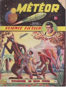 remarques: | fascicule no 73 de mai 1959 nos amis en vacance en Australie où Spencer veut expérimenter une machine à explorer les temps futurs mais par une erreur de manipulation, Spencer et Texas sont projetés dans l'avenir en l'an 5,002,009 soit 5 millions plus tard et se retrouvent abandonnés dans un monde hostile >> p. 4 des ornithorynques géants et autres animaux géants Spade et un savant australien partent à leur recherche en emmenant cette fois un véhicule tout-terrain ils font connaissance avec de formidables anthropoïdes humains qui sont en lutte contre des kangourous-singes géants qui ont fait prisonniers Spencer et Texas après avoir délivré Spencer et Texas, nos amis rejoignent le point de chronophorie pour retourner sur la terre ce sera été un voyage très éloigné dans un futur peu agréable >> l'idée est bonne mais le monde n'a guère changé après 5 millions d'années |