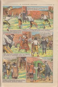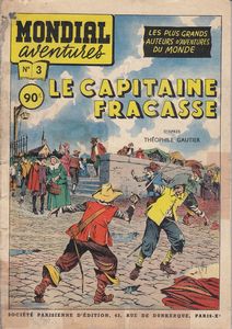 remarques: | album broché, 50% couleur 50% N&B, 48 pages, prix fr 90.- ABE pour les couvertures qui sont quelque peu frottées et avec quelques rattrapages de scotch invisible mais l'intérieur du cahier est bien frais en TBE, adaptation du roman de Theophile Gautier 1811 - 1872 scénario par Vidal, illustrations par Giffey époque de Louis XIII, le baron de Sigognac qui vit dans la misère en son château de Gascogne accorde le gîte à une troupe de comédiens et s'engage après coup dans la troupe en tant que matamore et en s'appelant le capitaine Fracasse >> p. 8 l'embuscade aux épouvantails le duc de Vallombreuse s'intéresse à la jolie comédienne Isabelle qui est défendue par Sigognac >> p. 13 le duel entre Vallombreuse et Sigognac la troupe arrive à Paris poursuivie par les sbires de Vallombreuse qui dépêche le spadassin Lampourde pour tuer Sigognac et enlever Isabelle mais Sigognac bat Lampourde qui devient son allié, toutefois Vallombreuse réussit à faire enlever Isabelle aidée par la petite Chiquita, le capitaine Fracasse avec fracas assiège avec ses amis le château de Vallombreuse et retrouve Isabelle mais l'arrivée du père de Vallombreuse interromp les hostilités et le vieux duc de Vallombreuse découvre qu'Isabelle est sa fille née d'un premier mariage, Isabelle reste au château avec son père et avec le fils de Vallombreuse qui est devenu son frère! alors que Sigognac dépité regagne son château miséreux, Vallombreuse fils, repenti, vient le retrouver et lui offre maintenant la main de sa soeur tout en informant Sigognac qu'il a été nommé capitaine d'une compagnie de mousquetaires du roi >>> un superbe album tant pour le scénario que pour les illustrations qui sont excellentes (le talent de Giffey dans le graphisme est presque unique) avec en prime une superbe couverture côte de l'album en BE Euros 80.- n.b. il y eut plusieurs éditions du capitaine Fracasse par d'autres dessinateurs dont une réédition de Giffey par les éditions Glénat mais en noir&blanc et avec un graphisme moins bon que l'exemplaire de Mondial Aventures qui restera unique en son genre |