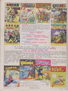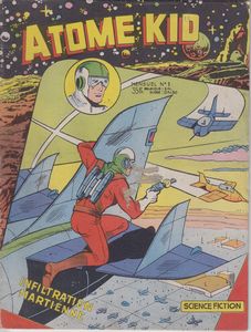 remarques: | premier fascicule d'Atome Kid de novembre 1956, la série comprend 35 fascicules de novembre 1956 à septembre 1959 ce fascicule comprend un récit complet d'Atome Kid, le personnage d'Atome Kid a été créé par Boya, un dessinateur espagnol peu connu qui sera aussi actif dans Cosmos lorsque ce magazine fusionnera avec Atome Kid au no 35 d'Atome Kid (septembre 1959) >> série collectionnée ici au complet Atome Kid est un genre de Superman, représenté en civil par le professeur Eddie Stuart = Atome Kid et par son épouse Pamela = miss Atome Kid, tous deux travaillent pour le bien du genre humain en collaboration avec le commissaire Malone qui, lui, ne sait pas qui est Atome Kid >>> des histoires pas trop recherchées avec un graphisme de petite qualité mais la série sera agrémentée du no 7 au no 34 de l'excellent feuilleton avec la famille Rollinson (voir information au fascicule no 7) Information Atome Kid est un personnage et un magazine mensuel français de bande dessinée en noir et blanc qui parut aux éditions Artima, comme souvent chez Artima, l'auteur de la série n'est pas indiqué: Bayo, dessinateur espagnol, placée dans un futur imprécis, cette série fait un mélange très kitch de personnages en costume des années 1950 et d'engins spatiaux voyageant de planètes en planètes dans tout le système solaire, les épisodes mettent en scène Atome Kid, une variante mineure de Batman qui, professeur Stuart dans la vie ordinaire, se change en héros en revêtant sa combinaison collante rouge, sa cagoule blanche et ses lunettes épaisses le rendent méconnaissable, condition indispensable à l’incognito nécessaire à ce type de héros, sa réputation, son propulseur dorsal, son pistolet paralysant et l'aide occasionnelle de son épouse Pamela, dotée du même équipement, sont ses seuls atouts pour confondre escrocs, imposteurs et autres malfrats à la demande du commissaire Malone, et parfois pour lutter contre quelques ambitieux voulant devenir maîtres du monde. la première publication paraît aux éditions Artima de novembre 1956 à septembre 1959, en 35 numéros sous forme de cahier de 32 pages agrafés, le dessin de la couverture en couleur est inspiré de l’épisode d’Atome Kid, cette série est diffusée dans les pays francophones au prix de 35 francs français de l’époque (40 francs français à partir du numéro 17 en mars 1958), 5 francs belges et 0,5 francs suisses, le numéro 20 est un numéro spécial à 75 francs, à partir du numéro 7, les fascicules Atome Kid réservent la moitié de leurs pages à la saga de la famille Rollinson dans l'espace, jusqu'à l'avant-dernier numéro, réduisant les épisodes d’Atome Kid à 16 pages, le 35ème et dernier numéro est partagé entre un épisode d’Atome Kid, et deux récits de science-fiction, après le 35e numéro, le titre Atome Kid disparaît, et les aventures d'Atome Kid sont reprises dans les fascicules Cosmos. seconde série l’éditeur Arédit qui avait racheté les éditions Artima fit reparaître dans les années 1970 une seconde publication titrée Atome Kid en petit format broché (18 par 13 cm) de 132 pages, en noir en blanc avec une couverture en couleur, trente numéros furent publiés de septembre 1970 à mars 1977, à un rythme trimestriel puis bimestriel en 1974-1975, puis de nouveau trimestriel, au prix de 1,50 francs français, ensuite 2,00 FF en 1974, 2,50 FF en 1976, pour finir à 3,00 FF en 1977. une traduction allemande des sept premiers numéros de la première série française fut publiée entre octobre 1960 et avril 1961, sous le titre Atom Kids, cette série est publiée en 1957 en espagnol sous le nom d'Atomo Kid aux éditions Toray (es) de Barcelone, en 16 numéros de 28 pages chacun |