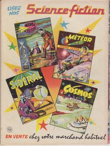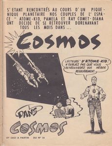 remarques: | fascicule no 35 de septembre 1959, dernier numéro de la série qui fusionne avec Cosmos pour devenir Atome Kid Cosmos 1/ un épisode d'Atome Kid: Verne au XXVème siècle qui s'accorde tout de même aussi une pipe à la fin du récit! 2/ un épisode d'Alan Ryder, pilote de l'air: le dernier SOS 3/ un épisode neutre: pirates interplanétaires |