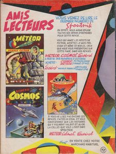 remarques: | fascicule no 34 de septembre 1960, sans épisode de Pilote Tempête avec trois récits d'auteurs inconnus: - Rugier l'invulnérable - le perturbateur - patrouille sidérale dernier numéro de la série Spoutnik annoncé en dernière page: "vous venez de lire le dernier no de Spoutnik, en effet, nous avons épuisé toutes nos séries d'histoires pour cette revue", les histoires SF continuant dans les revues Meteor, Cosmos et Sidéral n.b. les revues Aventures Fiction et Monde Futur se terminant également en septembre 1960 |