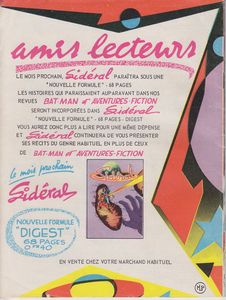 remarques: | fascicule no 27 de juin 1960 dernier de la série Sidéral format 17x23 cm, la série continue sous forme de petit format n.b. l'annonce de l'éditeur Artima au 4ème plat: "le mois prochain, Sidéral paraîtra sous une "nouvelle formule" de 68 pages, les histoires qui paraissaient auparavant dans nos revues Batman et Aventures Fiction seront incorporés dans le nouveau Sidéral 1/ la planète et le pendule (Adam Strange) 2/ attaque sur fort satellite "s'évadant de leur réserve de la lune, les peaux-vertes lancèrent une série de raids éclairs sur les avant-postes terriens de l'espace" 3/ le secret du géant de l'espace |