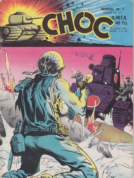 remarques: | Choc (1ère série) est une revue de l'éditeur Artima, la série débute en récit complet (format 17x23 cm pour 36 pages, pour les six premiers numéros (no 1 10/69 au no 3/60), à partir du no 7 (avril 1960) jusqu'à la fin en 1965, elle passe en petit format, parution de sept numéros spéciaux en 1964 et 1965, adaptation de comics de guerre américains dessinés pour la plupart par J. Grandenetti, Mort Drucker et Joe Kubert, récits de guerre dont notamment "le tank hanté" de Bob Kanigher ou sergent Rock d'origine DC (Detective Comics), récits de guerre relativement de qualité moyenne seuls deux fascicules de la 1ère série sont collectionnés ici à titre d'exemplaires représentatifs résumé no 1 d'octobre 1959 1/ banc d'épreuve 2/ le chemin de la torpille 3/ la bataille et les manoeuvres 4/ 3 scènes de guerre 5/ un périscope de sauvetage Information il y eut une série similaire intitulé "Commando" de 6 numéros, 1ère série, format 17x23 cm, du no 1 (10-59) au no 6 (3-60) qui continua de paraître au no 7 en petit format |
