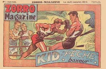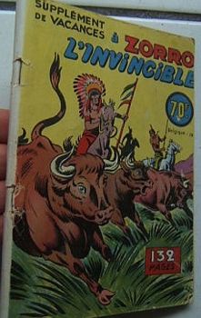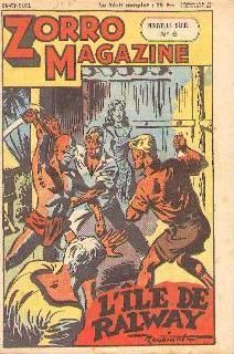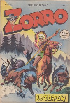 remarques: | mensuel, 28 pages, N&B, 35.- fr marqué supplément de Zorro, 14 nos du 3-1953 au 5-1954 cette série classée dans récit complet, comporte 14 fascicules en partie grand format et format moyen ainsi qu'un supplément Zorro vacances juillet 1953 (très rare), tout comme le no 1 de mars 53 titré Pacific railways n.b. seuls les numéros 2, 3, 13 et 14 sont collectionnés ici no 2 mai 1953 - Zorro le justicier, le totem (western) by Oulié n.b. ce cahier ne contient que des bandes de Zorro et Zorro ne porte qu'un masque-loup Information dans le genre récit-complet, il y a encore eu 2 séries titrées Zorro: 1/ Zorro-Magazine, 24 numéros du 7/1950 au 7/1951, format à l'italienne mais sans bandes avec Zorro, le personnage principal étant Kid "Pêche" boxeur, dessinateurs: Pellos, Nortier, Bob Dan, Roubinet, Le Goff et Marcireau 2/ Zorro-Magazine, nouvelle série, 30 numéros du 8/1951 au 10/1952 (mais datation désordonnée), format à l'italienne et toujours sans bandes de Zorro, dessinateurs: Forton, Le Goff, Roubinet et quelques bandes par Pellos, Marcireau, Oulié et Toussaint n.b. la série Zorro-Magazine, nouvelle série se poursuit dans le fascicule Robin (Zorro-Magazine), 15 numéros de mars 1953 à juin 1954 avec les bandes principales de Robin l'intrépide par Oulié |