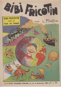 remarques: | cahier broché, 1ère édition AG, 50% couleur 50% noir&blanc, 48 pages, au prix de fr 75.-, 4ème plat PUB Perrier, présentation avec texte sous images qui ne contiennent pratiquement pas de bulles après ses péripéties au cirque Bobino, Forton fait faire à Bibi Fricotin le tour du monde et le présente au directeur de l'Epatant qui promet à Bibi fr 100'000 si il réussit à accomplir cet exploit le premier problème qui se pose pour Bibi, c'est de trouver l'argent pour pouvoir partir, il se débrouille et rejoint Liverpool pour embarquer vers les Amériques >> p. 8 tirer l'oreille à un boa (façon de parler!) aventures avec Mouchaboeuf, le passager ringard du navire "Trafalgar" qui fait naufrage et Bibi s'échoue sur une plage près de New York, démêlés (sic!) avec le nègre Bamboula, Bibi continue son voyage en wagon Pullman vers San Francisco via Omaha City et Kansas City où Bibi rencontre le chef peau-rouge Rayon d'Or, après s'être débarrassé de nombreux outlaws et être devenu temporairement chercheur d'or, Bibi continuera son voyage en ballon >> p. 33 Bibi Fricotin habillé en cow-boy enfin engagé comme matelot sur un cargo-boat, Bibi cingle vers les Philippines >> des aventures cocasses mais pas encore extraordinaires malgré un bon graphisme de Forton et une jolie couverture d'album |