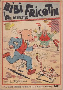 remarques: | cahier broché, 1ère édition papier AG, 50% couleur 50% noir&blanc, 48 pages, au prix de fr 60.-, 4ème plat PUB Perrier, illustrations Forton, couverture Forton présentation avec texte sous images qui ne contiennent pratiquement pas de bulles de retour en France et devenu riche de par ses exploits, Bibi Fricotin décide de devenir détective, il devient la terreur des cambrioleurs >> p. 11 Bibi et son chapeau de détective >> p. 16 le sourd-muet qui devient unijambiste >> p. 25 Bibi affublé d'une tête de veau (sujet de la couverture) >> p. 34 un Bibi bosselé >> p. 45 la menace des malfaiteurs: "je te réserve un chien de ma chienne" le bistrot = poste de secours contre la soif >> malgré quelques calembours, les enquêtes de Bibi Fricotin sont cette fois pas très convaincantes et se retournent même parfois contre lui, exemple avec le malfaiteur Evariste qui lui échappe toujours, le graphisme restant respectable |