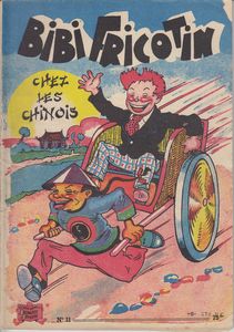 remarques: | cahier broché, 1ère édition AG, 50% couleur 50% noir&blanc, 48 pages, au prix de fr 75.-, 4ème plat PUB Perrier, dernier titre: no 25 Bibi Fricotin policier, texte et illustrations ainsi que couverture par Callaud présentation avec texte sous images qui commencent à contenir un peu plus de bulles Bibi est devenu chercheur d'or avec son ami Coco mais n'ayant rien trouvé, Bibi et Coco reprennent leur activité théâtrale comportant de nombreuses farces puis Bibi quitte Coco pour rejoindre le milliardaire Sir Crockbeller qui souffre de dépression et qui compte sur Bibi pour le guérir en le faisant rire en plus, on participe aussi à différentes chasses (tigre, boa, etc) et par la suite, tel Lavarède, Bibi est mis au défi de faire le tour du monde, il embarque comme passager clandestin sur un navire vers les Philippines avec Touh-Fouh le roi des chiens, comme compagnon, Bibi gagne ensuite la Chine, en chemin il est est engagé comme groom dans une compagnie de wagons-restaurants, il sauve la vie d'un mandarin et arrive peu après aux Indes >> p. 41 un fakir en catalepsie puis grâce à un aviateur qui cherche à battre un record de distance, Bibi toujours accompagné de Touh-Fouh regagne l'Europe >> pas beaucoup de chinoiseries dans ce cahier plutôt de petite qualité tant pour le scénario que pour le graphisme |