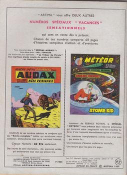 remarques: | numéro 46 spécial vacances, 7-1956, 68 pages, 65.- fr avec Dynamic Toni-Cyclone, format 16x22 cm à l'italienne >> commentaires Dynamic voir no 10 - 4 épisodes de Toni Cyclone par Roger Melliès: le raid de la "Trombe", les pirates de l'Amazonie, aventure en Mandchourie et alerte dans l'Antarctique - 2 épisodes de Bob Corton: (par les frères Giordan cette fois et non par Cazanave >> voir Vigor) l'enfer du désert et transit clandestin - 2 épisodes de Frank Nevil par les frères Giordan: la vallée perdue et au secours des Lawrence (aventures exotiques) |