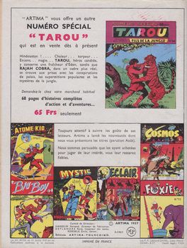remarques: | numéro spécial 59, 8-1957, 68 pages, 65.- fr avec Toni Cyclone, format 16x22 cm, - 2 épisodes de Toni Cyclone par Melliès: mission en Chine et les naufragés de l'air - 2 épisodes de Bob Corton par les frères Giordan: l'armée du désert et le puits d'Allah - l'île à éclipse par Georges Bourdin cet épisode a fait l'objet d'un album, >> voir section albums sous aventure |