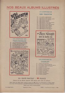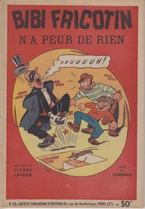 remarques: | cahier broché, 1ère édition AG, 50% couleur 50% noir&blanc, 48 pages, au prix de fr 50.-, 4ème plat présentation des albums SPE, dernier titre no 14 Bibi fait du cinéma présentation avec texte sous images mais les images commencent à contenir un peu plus de bulles que dans les cahiers précédents, premier cahier illustré complètement par Pierre Lacroix, texte par Corrald les illustrations de Lacroix n'en sont encore qu'au début mais s'affineront par la suite qui deviendra l'âge d'or des aventures de Bibi Fricotin Bibi Fricotin l'amuseur public no 1 cherche un emploi, il est engagé comme détective mais ses débuts sont difficiles >> p. 9 la palissade qui sert d'échelle et Bibi a bientôt contre lui la bande des Croquignols de Cognesec >> p. 25 le grand maître des Croquignols: Arsène Lapin, gentleman-gangster un vieux moulin modernisé, appelé le Castel des Courants d'Air, sert de refuge aux bandits, Bibi est capturé et va être passé aux instruments de torture des deux chinois Ri-Ka-Nan et Ki-Ri-Pah mais heureusement le moulin est assiégé par la police et la bande arrêtée sauf Arsène Lapin qui réussit à s'échapper, Bibi le retrouvera lors d'une corrida en Espagne où Lapin déguisé en toreador sous le nom de Arsenio Lapino sera démasqué par Bibi fort de ses succès, Bibi est appelé à New York pour combattre le fameux gangster Al Humett qui vient de kidnapper le fils du roi du boudin, nouveau succès pour Bibi qui devient le détective No. 1 >> les illustrations de Lacroix prennent lentement forme mais le scénario n'est toujours pas terrible n.b. Pierre Lacroix 1912-1994 devient l'assistant de Louis Forton et fait ses débuts chez SPE où il réalise surtout du graphisme publicitaire, en 1947 il hérite de Bibi Fricotin qu'il ne quittera qu'en 1988 à l'âge de 76 ans, il lui adjoindra Razibus Zouzou, un jeune comparse noir, Lacroix bénéficiera d'une publication exceptionnelle à la SPE avec l'édition d'albums sous couverture cartonnée rigide, en parallèle aux histoires de Bibi, en 1953-1954 Lacroix remplace Pellos pour trois épisodes des Pieds Nickelés, par la suite il crée de nombreuses séries humoristiques pour Friponet, le Journal de Bibi Fricotin, Lisette, etc, il reprendra aussi un épisode dans la série des Charlot et à la mort d'AL.G., il reprend Aggie qui sera peu après confiée à J. Pascal, on reconnait aisément le style de Lacroix à une certaine rondeur des personnages et à une ligne rapide, claire et efficace très lisible bibliographie: Bibi Fricotin, Aggie, les chahuteurs, Charlot, Mick et Mack, les Pieds Nickelés, Placide et Pomato |