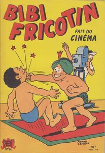 remarques: | cahier broché, 3ème édition AG, 50% couleur 50% noir&blanc, 48 pages, au prix de fr 90.-, 4ème plat PUB Pschitt, dernier titre: no 38 Bibi contre les kidnappeurs, illustrations Lacroix, texte Lortac présentation avec texte sous images qui commencent à contenir un peu plus de bulles Bibi Fricotin est engagé par le yankee Alan Pluto Ford pour faire du cinéma mais déjà des malotrus sabotent les mises en scène >> p. 9 le cochon Truffard pour la chasse aux truffes nanti de son expérience, Bibi devient reporter/cameraman et part tourner un fil sur la révolution dans l'état de Partézuéla, puis ce sera un reportage sur les soucoupes volantes, toutefois Bibi doit maintenant rivaliser avec Geoffrey, reporter à Léo Film >> p. 24 une bouillabaisse de serpent de mer reportage aussi sur les essais nucléaires dans le désert où Bibi est capturé par des pillards, il réussit à s'évader et fera connaissance avec Mathusalem le lion qui devient son fidèle compagnon ce qui donne à Bibi l'idée de tourner un film avec son lion apprivoisé sur les safaris, Bibi prend comme assistant le nègre Vazymonkoko, par la même occasion, Bibi tourne le film "le fils de Tarzan" avec Greta Carbure, Mathusalem le lion étant la vedette du film et Bibi jouant le rôle du fils de Tarzan! enfin Bibi tourne un dernier film en jouant Robinson Crusoë, il est alors reconnu comme une vedette internationale célèbre >> si le graphisme de Lacrois s'améliore, le scénario de Lortac n'est vraiment pas extraordinaire n.b. à partir de ce numréro, SPE commence à éditer des albums cartonnés sur les aventures de Bibi (en édition limitée) qui seront recherchés par les collectionneurs avec des côtes BDM allant de Euros 60.- à 80.- |