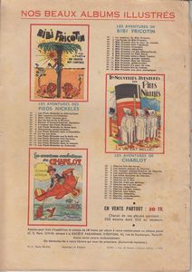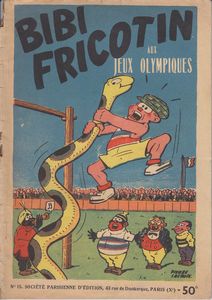 remarques: | cahier broché, 1ère édition AG, 50% couleur 50% noir&blanc, 48 pages, au prix de fr 50.- dernier titre: no 15 Bibi aux jeux olympiques, couverture et illustrations par Pierre Lacroix, texte par Debois présentation avec texte sous images mais les images commencent à contenir un peu plus de bulles que dans les cahiers précédents avec son boa Cogo, Bibi Fricotin devient, en tant qu'adjoint du directeur technique, membre de l'équipe française qui participe aux jeux olympiques à Londres >> p. 7 les adversaires principaux des français: l'équipe chinoise = des athlètes à l'épiderme cuivré et Bibi, le petit parigot, doit faire façe à de nombreux sabotages - l'affaire du saut à la perche contre Pou-Lô-Ri et avec l'aide de Cogo le boa qui fait fonction de perche, Bibi bat le record du monde de saut à la perche puis c'est la course à pied où Cogo joue à nouveau un rôle déterminant >> p. 24 l'entraîneur chinois Van-Du-Toc qui renifle la piste de Bibi >> p. 28/29 le concours des régates puis c'est encore une partie de waterpolo contre les Groenlandais et la blague des trois faux bibis contre des concurrents qui veulent enlever Bibi >> p. 45 dernière épreuve: la course marathon contre le champion zanzibaréen >> les jeux olympiques rendent la série Bibi Fricotin un peu meilleur, série qui prend maintenant avec Lacroix un nouveau départ, graphisme et scénario respectables n.b. un des derniers cahiers avec le texte sous les images |