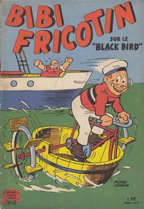 remarques: | 2ème édition AG, 50% couleur 50% N&B, 48 pages, prix 1 NF, 4ème plat PUB Pschitt, dernier titre: no 47 Bibi contre l'homme masqué, il est aussi mention dans le générique des aventures de Bob Flapi, l'athlète, comportant 7 numéros illustrations Pierre Lacroix, texte Debois cahier avec bulles dans les images et sans texte sous les images >> commentaires voir tome original no 16 >> p. 26 il n'y a pas de Perrier à offrir mais le fouet fait "pschitt" >> un scénario très faible sur les aventures de Bibi Fricotin, le texte a été aussi corrigé par rapport à la 1ère édition et même le graphisme de Lacroix commence à baisser en qualité >> comparer avec le cahier 1950 4ème plat Perrier |